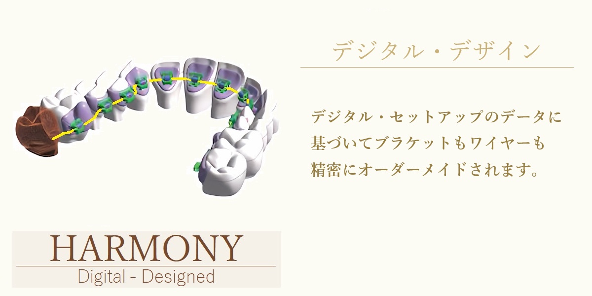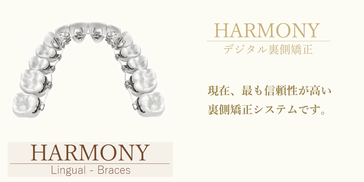デジタル裏側矯正 デジタル裏側矯正は、治療経験が豊富な裏側矯正専門の歯科医師の指示によりデジタルで治療計画を立てるだけでなく、ブラケットやワイヤーもデジタルでオーダーメイドで設計されます。そのため正確で質の高い裏側矯正治療を可能にします。 当院ではハーモニーという現在最も精密でハイクオリティな矯正治療ができるデジタル・オーダーメイド裏側矯正システムを採用しています。 ハーモニー裏側矯正は、スキャンデータから理想の歯列をデジタル上でシミュレーションしたセットアップ・データを作り、このデータを基にブラケットやワイヤーがオーダーメイドされます。 まずは口腔スキャナーi-Teroで歯列をスキャンしてデジタル・データ化します。 このスキャンデータから理想の歯列をデジタル上でシミュレーションしたセットアップ・データを作り、このデータを基にブラケットやワイヤーがオーダーメイドされます。 ブラケットとワイヤーはロボット技術で自動生産されます。 またブラケットは金属を削り出すミリニング法で製作されるので精密です。 従来の歯科技工士が手作業で作っていたブラケットよりも遥かに正確な矯正治療が可能です。 裏側矯正でオーダーメイドする理由 歯列矯正では、歯列の表側をアーチの形状に揃えて歯を配列します。 表側矯正なら、 歯の表面にブラケットを装着して、歯列アーチの形状のワイヤーを付けるだけで簡単に、歯列をキレイなアーチの形状に配列することができます。 しかし、歯の裏側に装置を付けると、1個1個の歯は厚さ(奥行)が異なるので、これらを考慮してブラケットの厚さやワイヤーの形状で調整して、歯列の表側がアーチの形状に揃うように設計する必要がございます。 前歯の裏側は、凹凸があります。ブラケットが密着して装着するために、ブラケットの接着面を歯面の形態に合わせます。 歯の裏側は、前歯は斜めに傾斜していますが、奥歯はほぼ垂直になっており、前歯と奥歯で歯の裏側の角度が異なります。 歯の裏側に装置を付ける場合は、個々の歯の角度も調整する必要がございます。 ハーモニー裏側矯正を選んだ理由 【理由1.】治療結果が良好【理由2.】クリップ式のブラケット【理由3.】メタル一体型のブラケット【理由4.】患者様のご希望にキメ細やかに対応できる。 ハーモニーではデジタルで矯正治療後の歯列をシミュレーションし治療計画が立てられます。このシミュレーションに合わせてブラケットとワイヤーが設計されCAM/CADという技術で精密にオーダーメイドされます。 そのため優れた治療結果が裏側矯正でも簡単に得られます。 歯に確実に矯正力が伝わるように、ワイヤーは歯の中心から近い所を通るように設計されています。 そのためオーダーメイドされたワイヤーの形状はストレートではなく所々折れ曲がったデザインです。 またワイヤーが歯の近くを通ることでブラケットの厚みが薄くなり、快適です。 ハーモニー裏側矯正では、仮に前歯に段差が残ったなど最終調整が必要な場合も、歯科医師がワイヤーを曲げて調整はしません。 修正用のワイヤーをオーダーメイドし、この修正用のワイヤーを通常どおりサイズアップしていきます。 ハーモニー裏側矯正のブラケットはクリップでワイヤーを確実に装着します。そのため正確な矯正治療を可能とします。 矯正治療の初期の段階では、ブラケットとワイヤーの摩擦抵抗が少なく、歯の動きがスムーズで痛みが少ないというメリットもございます。 またワイヤーの着脱がクリップを開閉するだけと簡単なので、患者様が診療中に口を開いている時間を少なくできます。 ハーモニー裏側矯正のブラケットは破損や脱離が少ないメタル一体型になっています。 このようなトラブルは治療の進行の妨げになり、治療期間が長くなる原因にもなります。 仮にブラケットが脱離しても、歯ごとに作られた専用のポジショニング・トレーで正確に元の位置に再装着できます。 ハーモニー裏側矯正のオーダーセンターは東京にあり、制作を担当する歯科技工士とチャットや電話で日本語できめ細かく患者様のご希望を伝えることが可能です。 非抜歯 935,000円(税込)小臼歯抜歯 1,210,000円(税込) 非抜歯 888,250円(税込)小臼歯抜歯 1,149,500円(税込) 非抜歯 841,500円(税込)小臼歯抜歯 1,089,000円(税込)