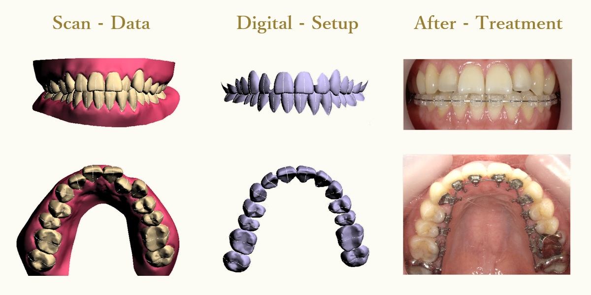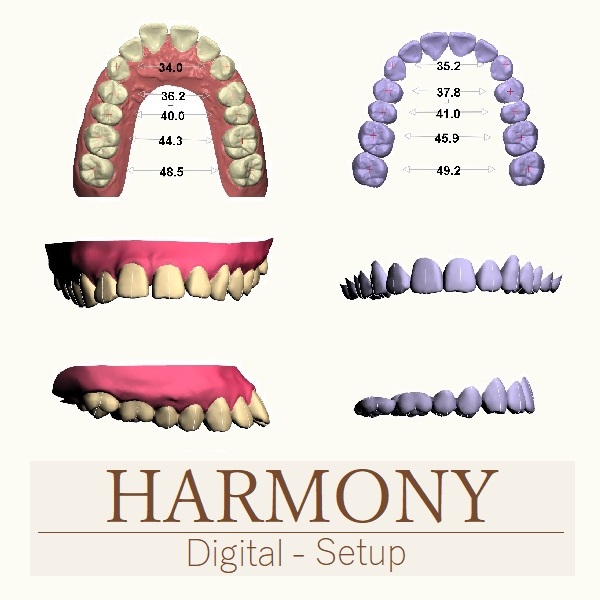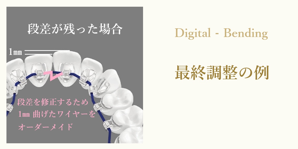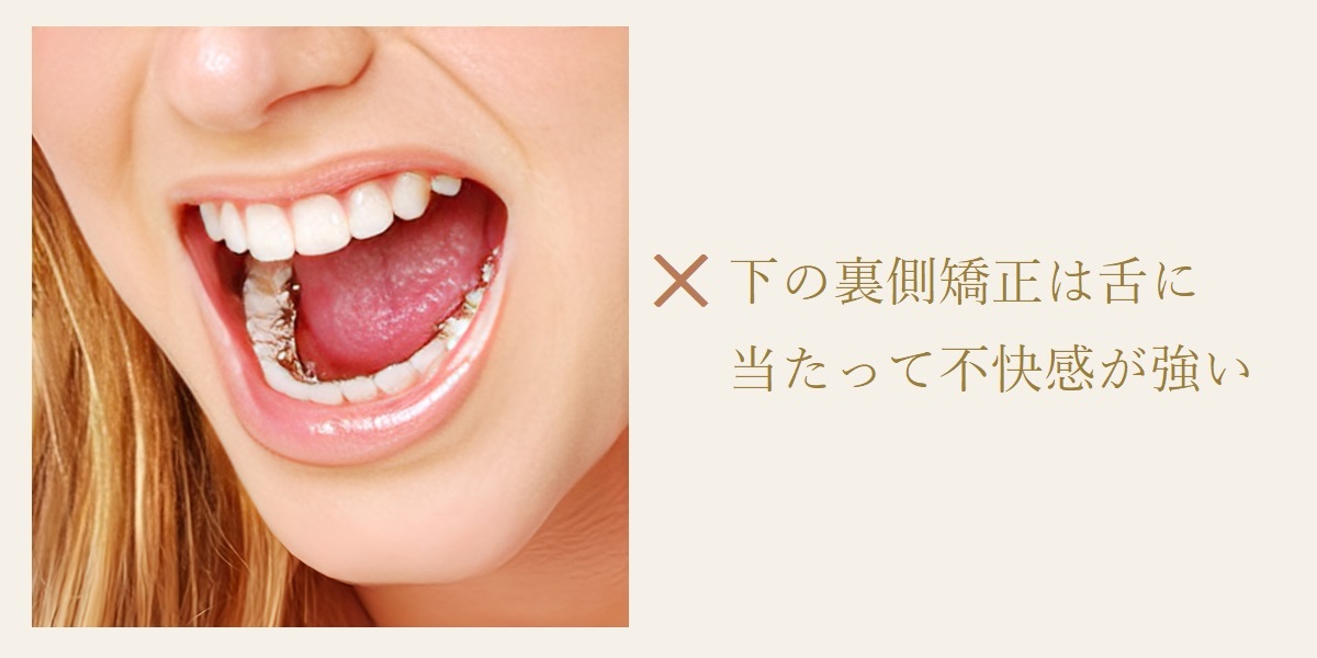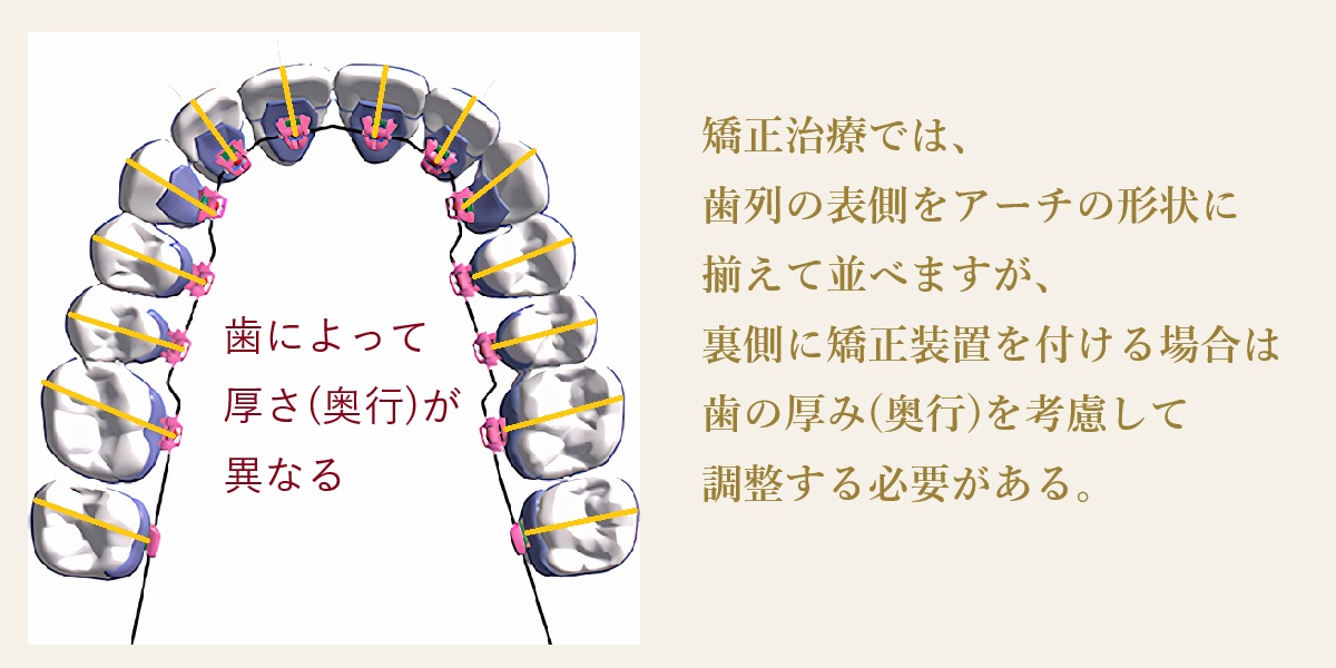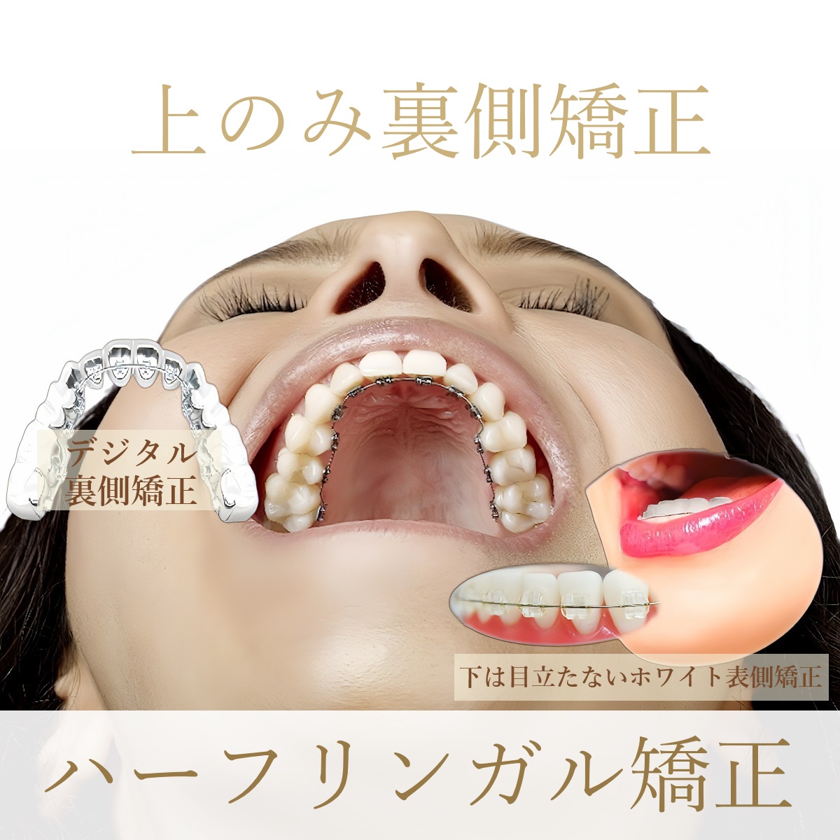 ハーフリンガル矯正とは? ハーフリンガル矯正は、上は見えない裏側矯正(リンガル)、下の歯は表側の歯列矯正です。 裏側矯正のことをリンガル矯正とも言うので、上のみ裏側矯正なので、ハーフリンガル矯正と呼びます。 ハーフリンガル矯正の特徴 特徴1.上が裏側なので目立たない特徴2.上下裏側矯正より費用が安い特徴3.上下裏側矯正より快適 ハーフリンガル矯正は目立つ上は裏側矯正で目立たず、しかも上下裏側矯正よりも費用が安く済みます。 また下の歯が表側なので、舌に当たらず快適です。 目立たない矯正を安くできると評判です。 上は裏側矯正 他人からよく見える上の歯は裏側なのでワイヤーやブラケットなのどの矯正装置が見えません。 下は目立たないホワイトの表側矯正 下の歯は唇で隠れ、他人から見えにくいので裏側でなくても目立ちません。当院では、白いブラケットで更に目立ちにくくしています。下の歯は表側矯正の方が快適です。 ハーフリンガル矯正のイメージはこのようになります。上の歯は裏側に付いているので、このように見えません。 【下が裏側矯正のデメリット】 ・違和感が強い・費用が高い・矯正の難易度が高くなる 下の歯も裏側の場合、舌が常に当たって違和感が強くなります。 そこでハーフリンガル矯正では、下の歯は表側矯正で快適性を優先しています。 料金もリーズナブルです。 また取り扱う医療スタッフの側も舌が邪魔になり操作が煩わしい、下の前歯は幅が狭いのでブラケット間隔が短く調整が難しいという術者側にも難点がございます。 ハーフリンガル矯正の治療例 非抜歯治療例右上の八重歯を主訴にカウンセリング治療期間:8カ月経過副作用:矯正治療に伴う痛みが生じることがございます。 上顎はデジタル裏側矯正 TBDC東京ビアンコ歯科・矯正歯科のハーフリンガル矯正では、上顎は精度の高い矯正治療を可能にするハーモニー・デジタル裏側矯正を採用しております。 ハーモニー・デジタル裏側矯正では、スキャン・データから理想の歯列をデジタル上でシミュレーションしたセットアップ・データを作り、ブラケットやワイヤーをオーダーメイドいたします。 上の画像ではセットアップ・データどおりに矯正できているのがわかります。 裏側矯正をオーダーメイドする【3つの理由】 歯列矯正では、歯列の表側をアーチの形状に揃えて歯を配列します。 表側矯正なら、 歯の表面にブラケットを装着して、歯列アーチの形状のワイヤーを付けるだけで簡単に、歯列をキレイなアーチの形状に配列することができます。 しかし、歯の裏側に装置を付けると、1個1個の歯は厚さ(奥行)が異なるので、これらを考慮してブラケットの厚さやワイヤーの形状で調整して、歯列の表側がアーチの形状に揃うように設計する必要がございます。 歯の裏側、特に前歯の裏側はデコボコとしており形状が複雑です。確実に装着するために、ブラケットの歯との接着面を1個1個の歯の裏側の形状に合わせる必要がございます。 歯の裏側は、前歯は斜めに傾斜していますが、奥歯はほぼ垂直になっており、前歯と奥歯で歯の裏側の角度が異なります。 歯の裏側に装置を付ける場合は、個々の歯の角度も調整する必要がございます。 HARMONY裏側矯正の【特徴】 先ずは歯科用3Dスキャナーで歯や歯列をデジタルデータで読み取ります。 通常は検査時にスキャンします。 【デジタル・セットアップ】 元の歯列データの歯を1個1個分割して、矯正治療後を予測した理想の歯列にデジタルでシミュレーションして配列いたします。 このシミュレーシされた歯列をセットアップと呼びます。 このデジタル・セットアップ・データを基に裏側矯正のブラケットとワイヤーが、HARMONY裏側矯正ではデジタルで精密にオーダーメイドされます。 デジタルでオーダーメイドされたブラケット・ワイヤーは精度が高く、治療結果が良好で、簡単にデジタル・セットアップ通りのキレイな歯並びになっていきます。 HARMONY裏側矯正はブラケットだけでなく、ワイヤーまでもロボット自動生産で精密にオーダーメイドされます。 歯に確実に矯正力が伝わるように、ワイヤーは歯の中心から近い所を通るように設計されています。そのためワイヤーの形状はストレートではなく折れ曲がったデザインです。 手順に沿って、ワイヤーを交換するだけで簡単にセットアップどおりに治療できます。 従来の裏側矯正では、最終調整を歯科医師がワイヤーをハンドテクニックで曲げていました。 これには誤差が生じやすく、何度もワイヤーを繰り返し曲げる必要があり、最終調整に高度な技術と時間を要していました。交換するだけで簡単にセットアップどおりに治療できます。 しかし、HARMONY裏側矯正では採取調整用のワイヤーをオーダーします。 最終調整用のワイヤーまでもロボット自動生産で精密にオーダーメイドされます。 最終調整も簡単で、治療期間が長引きません。 ハーモニー裏側矯正 HARMONY裏側矯正のブラケ