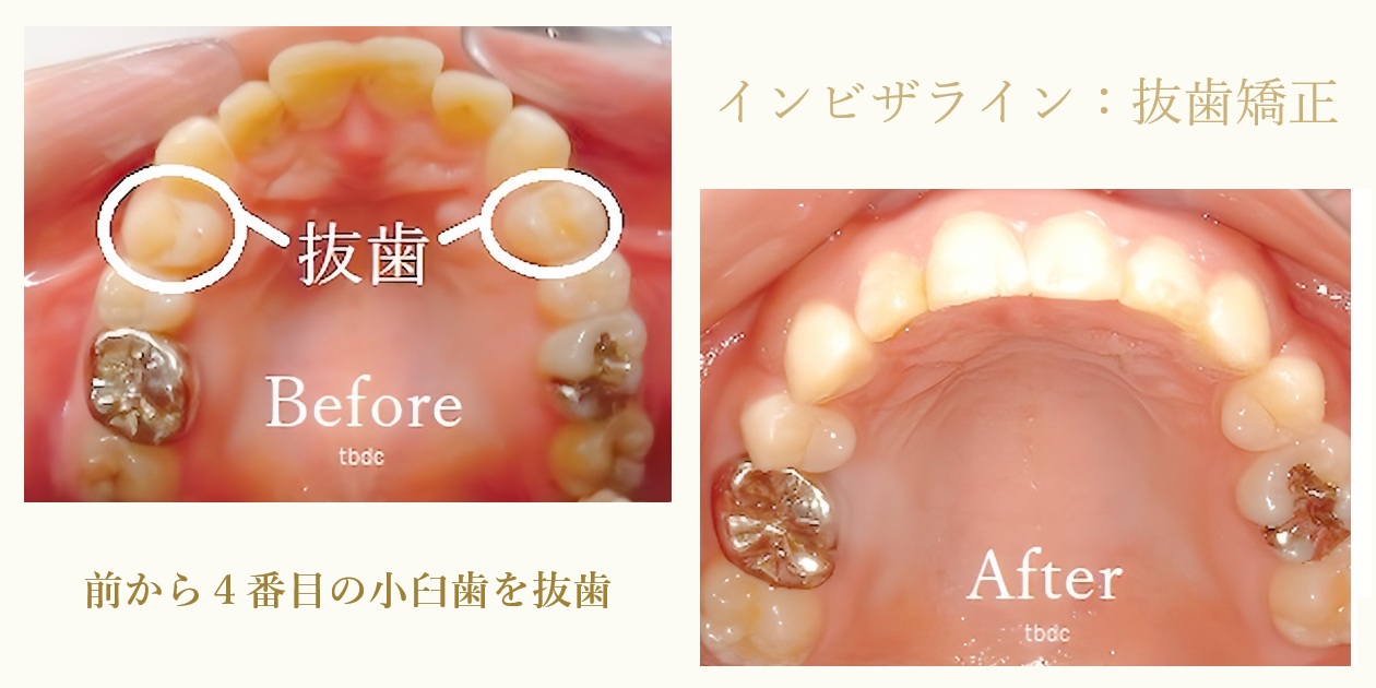 インビザライン矯正とは? 全世界で1500万人以上が矯正治療を受けている最も人気のマウスピース矯正です。 海外ではジャスティン・ビーバーさんがインビザラインで矯正していました。 日本でもEXIT、アンガールズ田中さん、アンジャッシュの児島さんがテレビでもインビザラインで矯正していると公表するなど多くの芸能人も利用しています。 インビザライン矯正の7つの特徴 インビザラインは現在最も人気がある矯正治療です。それには選ばれる理由があります。ここでは選ばれるインビザラインの特徴を7つ説明いたします。 特徴1.見えない矯正 インビザラインは透明なマウスピースを使用するので他人から気づかれません。 特徴2.衛生的 マウスピースは患者様ご自身で取り外し可能です。お食事や歯磨きの邪魔にならず衛生的です。矯正治療中に虫歯や歯周病になるのを予防できます。 特徴3.デジタル矯正 インビザラインは最も進化したマウスピース矯正です。矯正専門の歯科医師による治療計画に基づき、デジタルで矯正治療後の歯並びをシミュレーションします。【上の治療例 】でインビザラインによるマウスピース矯正でシミュレーションどおりに矯正できたことがわかります。 実際にマウスピースが作られて矯正治療が始まる前にシミュレーション動画で治療後の歯並び、それに至るプロセスで歯が移動していく様子を確認できます。マウスピースの個数からおよその治療期間もわかります。 【デジタルでスキャン 】インビザラインは歯列データをi-Teroという専用のスキャナーでデジタルで精密に読み取ります。 特徴4.歯のコントロールが確実 インビザラインのマウスピースは3Dプリンターで高い精度で製造されます。 マウスピースの内側は歯の大きさと寸分違わず、そのため他のマウスピース矯正よりも歯と適合しコントロールに優れています。 加えて、アタッチメントを歯に付けることでマウスピースが歯に引っかかることで、上下左右前後と3D方向に歯を確実にコントロールできます。 特徴5.複雑な歯並びも短期間 【インビザライン:非抜歯】Up to 26 PLAN治療期間:6ヶ月経過後マウスピース18個治療費用:650,000円(税込)副作用:矯正治療に伴う痛みや歯の動揺を伴うことがございます。このような複雑な歯並びの患者様でも6ヶ月でここまで矯正することが可能です。 実際にマウスピースが作られて矯正治療が始まる前にシミュレーション動画で治療後の歯並び、それに至るプロセスで歯が移動していく様子を確認できます。マウスピースの個数からおよその治療期間もわかります。 特徴6.抜歯矯正も可能 インビザラインのマウスピースは3Dプリンターで精密に作られ確実に歯をホールドし、アタッチメントで歯の平行移動も可能なのでマウスピース矯正で唯一公式に抜歯矯正に対応しています。 小臼歯の抜歯は当院でおこないます。 インビザラインは抜歯矯正に対応しているので、Eラインの改善もマウスピース矯正で可能です。 このようにインビザラインで1年でEラインが改善されました。【抜歯シミュレーション動画例】 上の抜歯矯正のシミュレーション動画ではマウスピースの個数は33個で約1年間になります。 インビザラインは抜歯矯正に対応しているので、歯を配列するスペースが大きく不足している重度な八重歯もマウスピース矯正で可能です。 この治療例では上下左右の第一小臼歯を合計4本抜歯し、ちょうど2年で矯正治療が全て終了いたしました。抜歯矯正もワイヤー矯正よりも短い治療期間で終了いたしました。 別の患者様ですが、こちらも上下左右の第一小臼歯を抜歯して8か月経過後です。現在は微修正中で、あと数ヶ月で終了予定です。 特徴7.裏側矯正よりも安い TBDC新宿院のインビザラインのコースには、マウスピースの個数が無制限の【No Limitプラン】、マウスピースの個数が26個までの【Up to 26プラン】がございます。 インビザラインのマウスピースの個数が無制限のプランです。※再オーダーは5年以内:1回につき+11,000円かかります。 【All in 料金とは?】検査料・調整料・リテーナー・消費税も含んだ料金になっております。 非抜歯 712,500円(税込)抜歯 760,000円(税込) 医院への直接の分割払いです。インビザラインの場合は頭金30万円以上が必要です。 非抜歯 693,000円(税込)小臼歯抜歯 742,500円(税込) マウスピース26個までのプランです。再オーダーは3年以内:2回目まで1回につき+11,000円、3回目以降は+44,000円かかります。 【All in 料金とは?】検査料・調整料・リテーナー・消費税も含んだ料金になっております。 非抜歯のみ 617,500円(税込) 非抜歯のみ 585,000円(税込) 【新宿院・限定】 大人のマウスピース矯正 30代・40代・50代の大人のマウスピース矯正を成功に導くTBDC新宿院限定の特別な治療プランです。詳しくは インビザライン・コラボ矯正 ワイヤー矯正を補助的におこなった後に、インビザラインのマウスピース矯正に移行します。