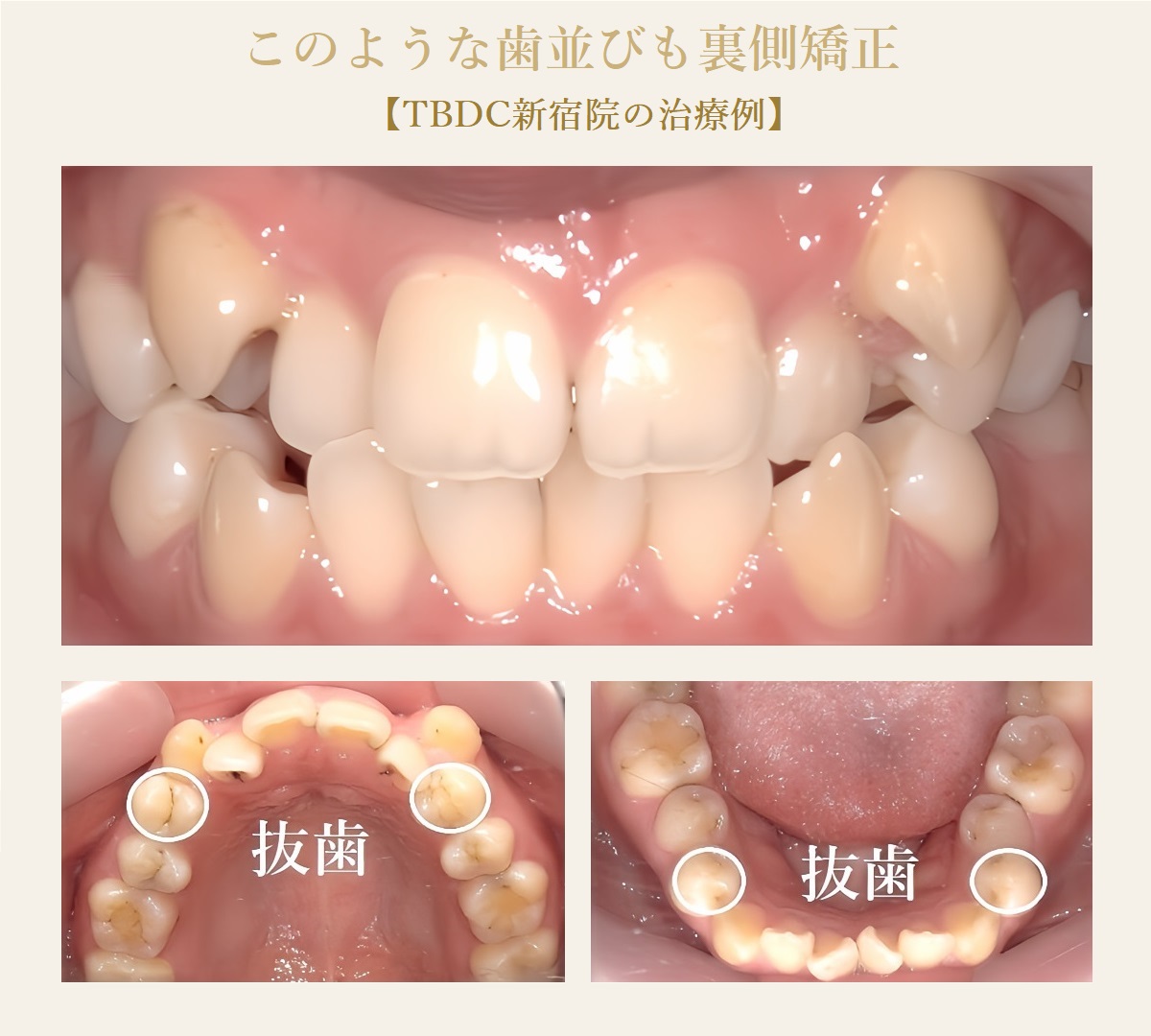 ハーフリンガル矯正とは? ハーフリンガル矯正は、上は見えない裏側矯正、下は目立たないホワイト表側矯正になっています。 マウスピース矯正は自信がない、続かなかった方にオススメの目立たない矯正治療です。 検査料・調整料・リテーナーも【All in 税込】の料金です。 よく目立つ上の歯には、他人から全く見えない裏側矯正を使用します。 下の歯は唇でほとんど隠れるので、あまり見えません。下の歯に目立たないホワイトの表側矯正なら、他人からほとんどわかりません。 ハーフリンガル矯正の正面からのイメージはこのようになります。 【実際のイメージ】 ハーフリンガル矯正とは?【意味】 ハーフリンガル矯正のLingual(リンガル)は英語で舌側=歯の裏側の意味です。 上下歯列の上だけの半分=Halfが裏側矯正なので、ハーフリンガル矯正といいます。 ハーフリンガル矯正【特徴】 【マウスピース矯正との比較】 ハーフリンガル矯正は、マウスピース矯正と比較して様々なメリットがございます。 ハーフリンガル矯正は、マウスピース矯正を途中で離脱した方のリベンジにオススメの目立たない矯正治療です。 マウスピースは食事の時には外す必要がございます。 しかし、ハーフリンガル矯正は食事の時でも外す必要はございません。 マウスピース矯正が続くかは自分次第です。【マウスピース矯正の使用法】・1日20時間以上を装着・10日でマウスピースを交換マウスピース矯正は自己管理ができず、途中で離脱する方がいます。 しかし、ハーフリンガル矯正は自己管理の必要がなく治療を続けられます。 ハーフリンガル矯正はワイヤー矯正です。 マウスピース矯正では困難な症例でも、あらゆる歯並びに適応できます。 ハーフリンガル矯正はワイヤー矯正です。 マウスピース矯正では、患者様のマウスピースの使用状況が悪いと歯の動きが不十分になります。 ハーフリンガル矯正なら、歯が確実に動きます。 ハーフリンガル矯正で使用する【デジタル裏側矯正】 TBDC新宿院ではハーフリンガル矯正の裏側矯正に、最新のデジタル裏側矯正・HAMONY(ハーモニー)を使用しています。 歯の動きに優れているので、このような複雑な歯並びも裏側矯正で治療可能です。 HAMONY(ハーモニー)はブラケットもワイヤーもデジタルで精密にオーダーメイドします。 デジタルでロボット製造されるので、誤差が少なく簡単に良好な治療結果が得られます。 クリップ式のブラケットは歯の動きがスムーズで、痛みが少ないというメリットがございます。 またワイヤーを確実にコントロールできるので良好な治療結果に繋がります。 クリップ式のブラケットで裏側矯正でキレイに治療できます。 メタル一体型のブラケットは破損や脱離といったトラブルが少なく、治療の進行がスムーズです。治療期間の短縮につながります。 HARMONY裏側矯正は、オーダーセンターが東京にあり、ネットまたは電話で担当技工士に日本語でキメ細かく患者様の希望を指示することができます。 【上下とも裏側矯正との比較】 ハーフリンガル矯正は、上下ともの裏側矯正と比較して様々なメリットがございます。 ハーフリンガル矯正は、上下とも裏側矯正と比較して快適というメリットがございます。 下の裏側矯正は、舌に矯正装置が常に当たります。 上下とも裏側矯正の場合は、違和感が強いというデメリットがございます。 ハーフリンガル矯正は上下とも裏側矯正と比較して料金が安く済むというメリットがございます。 一括支払い(現金・カード)またはDentalローンご利用の場合の料金になります。 検査料・調整料・リテーナーも【All in 税込】の料金です。 非抜歯 700,000円(税込)抜歯矯正 800,000円(税込) ※ワイヤー交換などの通院時の調整料も含まれています。※抜歯矯正では、小臼歯の抜歯費用も含まれています。 こちらは院内分割でのトータルお支払い金額になります。院内分割ではトータルのお支払い料金が少し高くなります。 非抜歯 825,000円(税込)抜歯矯正 990,000円(税込) 非抜歯 783,750円(税込)抜歯矯正 940,500円(税込) 【既に通院中の患者様】は診療チェア・スタッフを確保する必要がございます。通常のネット予約またはTELにてご予約ください。 TBDC東京ビアンコ歯科・矯正歯科【新宿院】 ハーフリンガル矯正以外のTBDC新宿院の矯正治療は【当院TOPページ】からご覧ください。 【歯科医師】 【アクセスMAP】 東京ビアンコ歯科・矯正歯科 新宿院〒160-0023東京都新宿区西新宿7-2-5TH西新宿ビル7F 【診療時間】 平日 11:00~13:00 15:00~20:00土曜 11:00~16:00休診日:日曜・祝日 【ご予約】 平日13:00~14:45は昼休憩のため電話対応はいたしておりません。